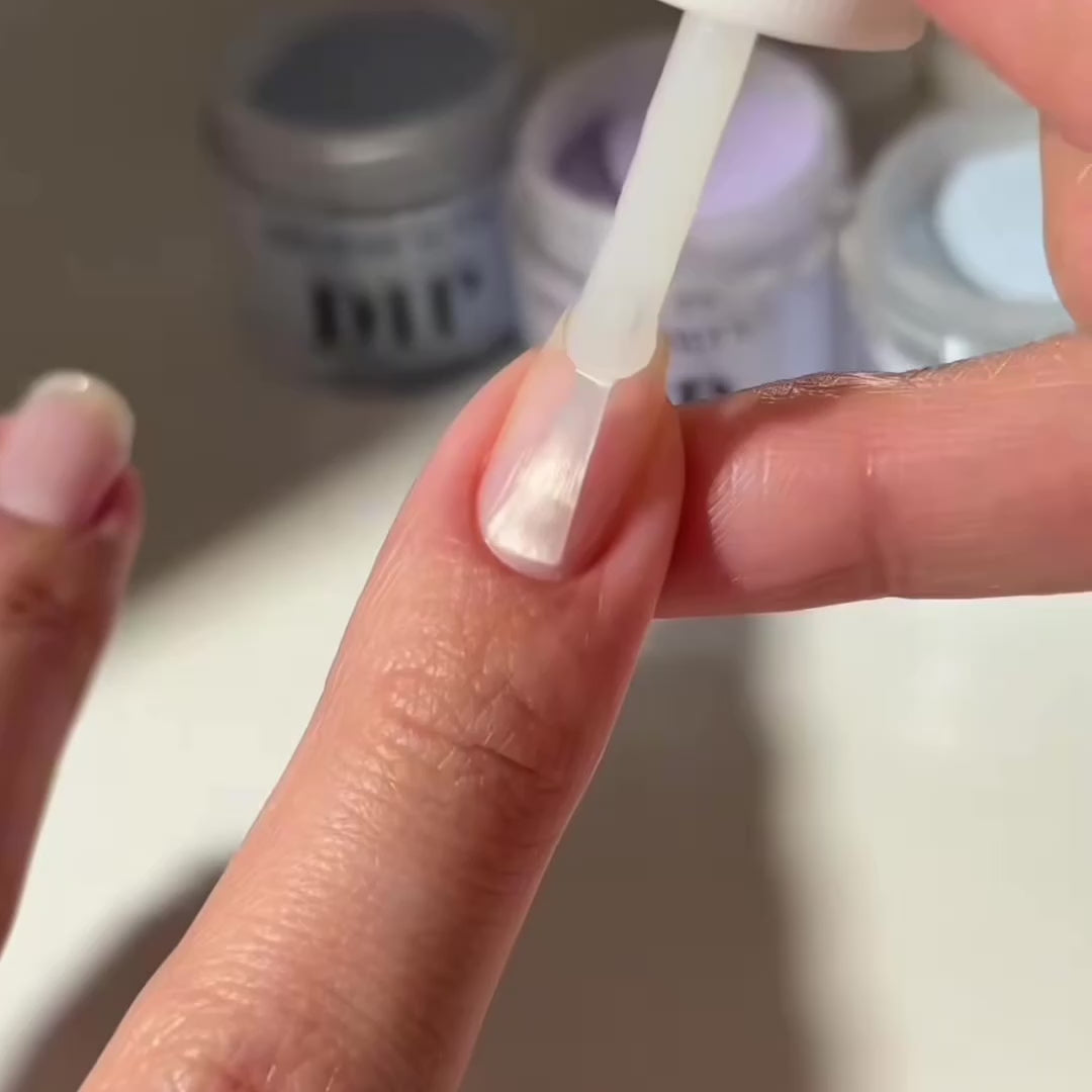 Appliquez une fine couche de Base Coat sur l'ongle et rungez votre doigt dans la poudre.